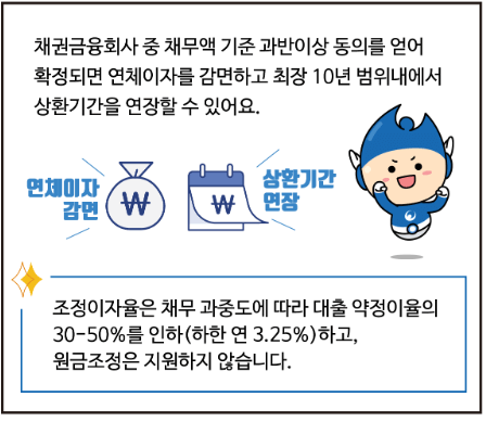 채무 상환 기간 연장 (최대 3년) 이자 감면 (최대 50%) 일부 채무 탕감 (최대 20%)